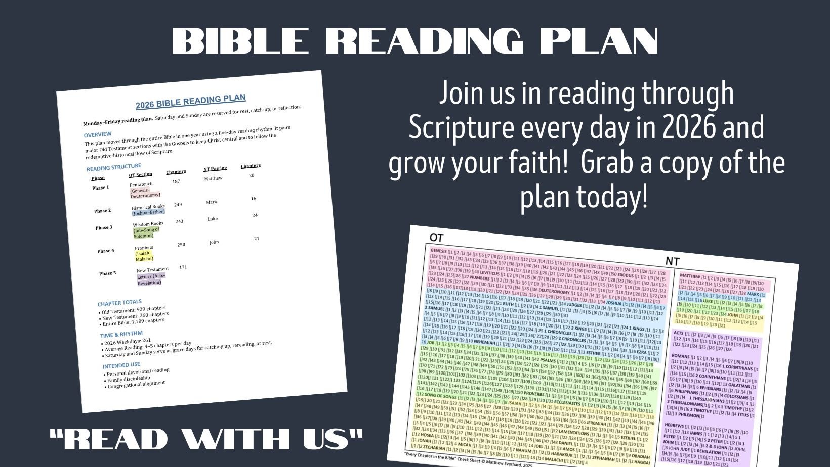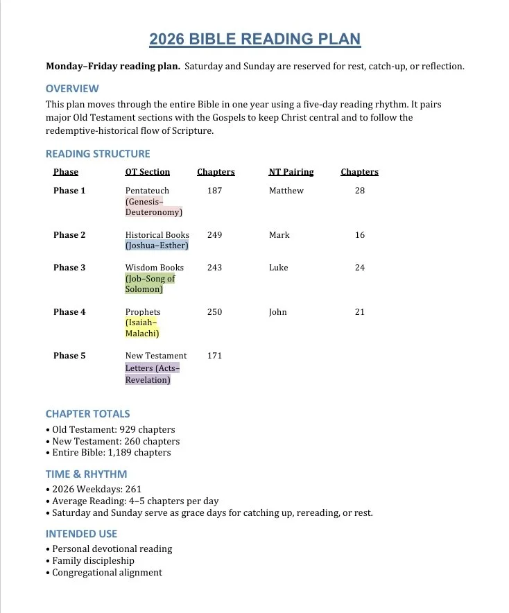 Committing to read the Bible is an important goal every Christian should have and we want to help you reach it. Start a new in ’26 by reading through the whole Bible in just one year! You can follow the plan below and if you’d like to keep a copy for yourself, simply click the “Download Plan” button.